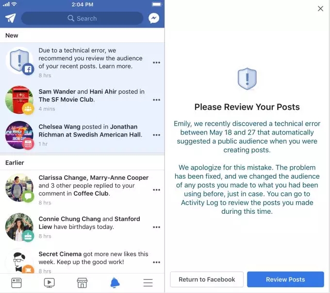 Facebook首席隱私官埃琳·伊根(Erin Egan)在一份聲明中稱,“從今天起我們將向受影響的用戶通報(bào)此事,要求他們?cè)u(píng)估在此期間發(fā)布的帖子。我們?yōu)檫@一失誤向用戶表示歉意?!?/span>
